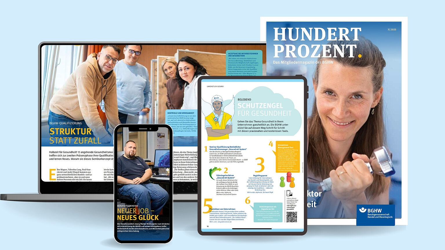 Das ganze Interview lesenEntdecken Sie noch mehr in unserem kostenlosen Printmagazin: Zum Beispiel die Geschichten von Menschen aus dem Handel und der Warenlogistik, die stets im Einsatz für mehr Sicherheit und Gesundheit am Arbeitsplatz sind. Diese und viele weitere exklusive Inhalte bietet die HUNDERT PROZENT Printausgabe dreimal jährlich.