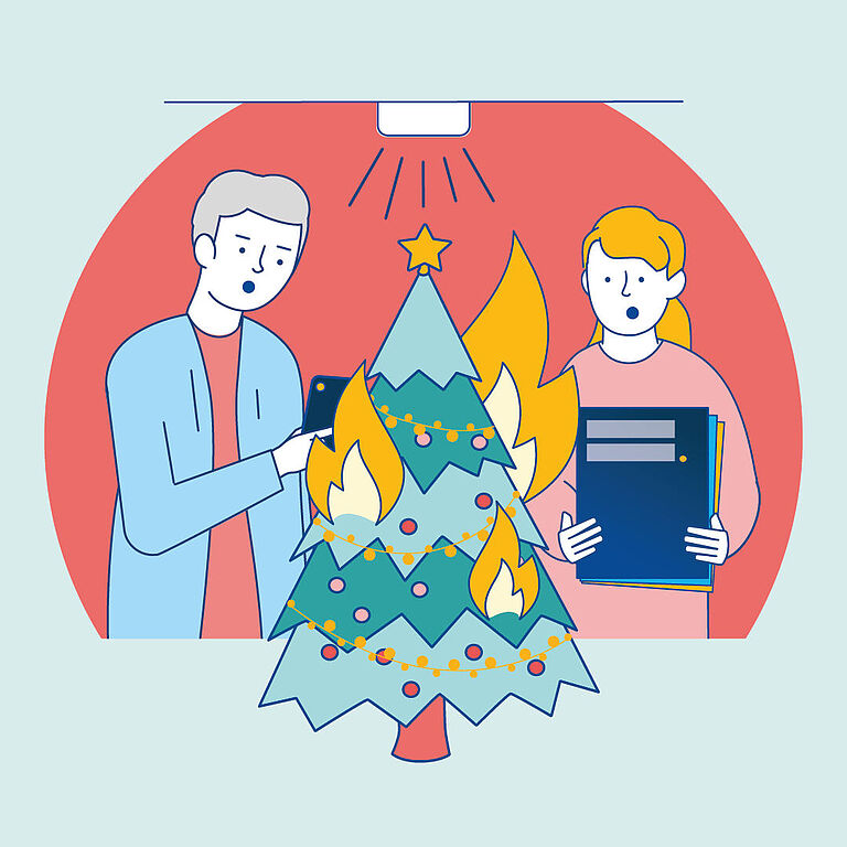Außerdem gilt: Beschäftigte dürfen nur mit elektrischen Betriebsmitteln arbeiten, die sich in einwandfreiem Zustand befinden. Wird eine Lichterkette aus dem Lager geholt, ist sie auf Mängel zu prüfen – gerade nach längerer Lagerung in feuchten Räumen oder auf Dachböden. Auch private Lichterketten, die Mitarbeitende etwa im Pausenraum aufstellen, müssen vor dem Gebrauch geprüft werden. Nur geprüfte Geräte dürfen in Betriebsräumen betrieben werden.