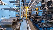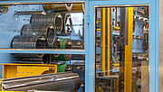 Der Roboter übernimmt nun die präzise Auswahl und Platzierung der Messer, abgestimmt auf den jeweiligen Kundenauftrag. So wird nicht nur die Ergonomie verbessert, sondern auch die Prozesssicherheit erhöht. Bislang wurden Messer traditionell per Hand bestückt: „Bestücken heißt, wir schieben auf die Ober- und Unterwelle eines Messervorbaudrehkreuzes verschiedene Kreismesser, Distanz- und Gummiauswerferringe, die dann wiederum vollautomatisch auf die Messerwellen der Kreismesserschere übergeben werden, um Spaltbänder je nach Kundenwunsch zuzuschneiden“, erläutert Maschinenführer Karsten Röper. Pro Schicht erfolgt dies bis zu zwölf Mal. Das heißt: schwere Kreismesser sowie Distanz- und Gummiauswerferringe per Hand aus einem Regal heben und auf die Wellen schieben. Nach dem erfolgten Zuschnitt wieder abbauen und für den nächsten Kundenauftrag die geforderte Anzahl von Werkzeugen erneut anbringen. „Bei einer Maschine, die bis zu 16 Millimeter dicke Stahlbänder zerschneiden kann, kann ein Messer schon mal bis zu 24 Kilogramm wiegen“, sagt Karsten Röper. Diese physisch sehr herausfordernde Arbeit übernimmt im Krefelder Werk jetzt ein Messerbauroboter, „eine Arbeitserleichterung vom Feinsten“, wie Karsten Röper zufrieden feststellt.