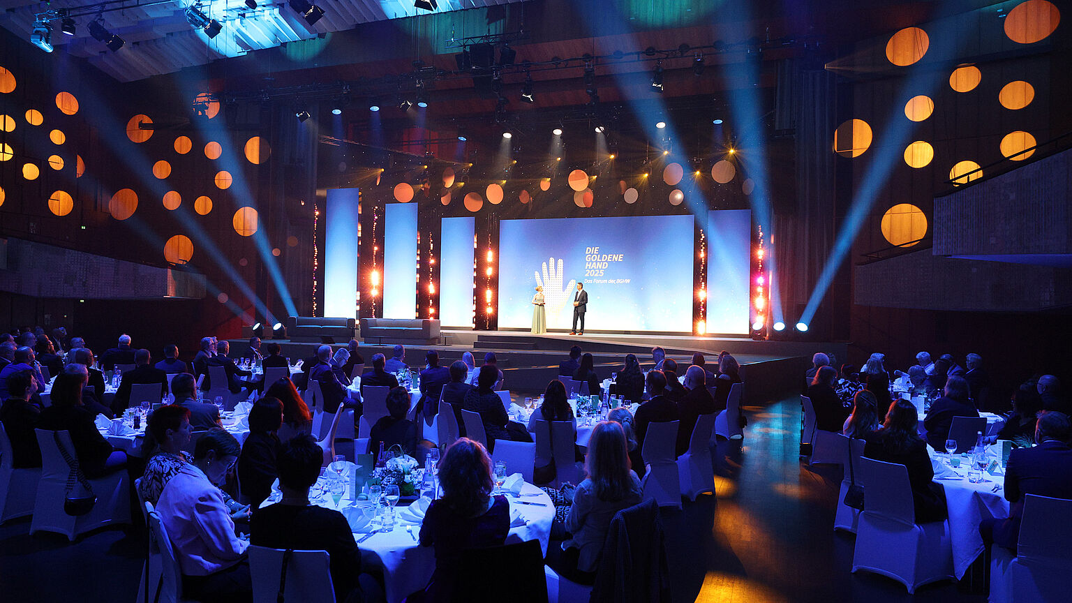 Die Verleihung von DIE GOLDENE HAND am 11. November war definitiv eine ganz besondere. Denn das erste Mal wurden in diesem Rahmen nicht nur Präventionspreise vergeben, sondern auch zwei Teilhabepreise. Damit brachte die BGHW bei der feierlichen Veranstaltung ihre beiden Säulen Prävention und Rehabilitation zusammen auf die Bühne und machte damit deutlich, wofür sie steht: Alles aus einer Hand. „Damit zeigen wir auch, dass die Berufsgenossenschaften insgesamt für die Menschen da sind, egal, ob es um die Unfallverhütung geht oder darum, Beschäftigte nach einem Unfall wieder zurück in den Arbeitsprozess zu bringen“, sagte Karl-Josef Thielen, Leiter der BGHW-Unternehmenskommunikation. Zusammen mit Iris Stelter, Leiterin der internen Kommunikation bei der BGHW, führte er die knapp 200 Zuschauerinnen und Zuschauer durch den Abend. In seinem Grußwort betonte Mannheims Bürgermeister für Wirtschaft, Arbeit, Soziales und Kultur Thorsten Riehle: „Sie (Anmerkung der Redaktion: die BGHW) sind eine zentrale Stütze der sozialen Marktwirtschaft, und es ist gut, dass es Sie gibt.“
