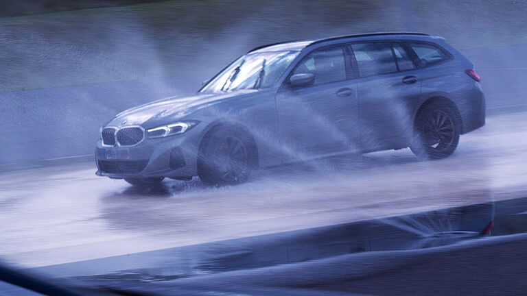„Kristin, du bist die Nächste. Vollbremsung vor plötzlich auftauchendem Hindernis. Lass laufen!“, fordert er sie auf. Die 35-Jährige startet den Motor und gibt Gas. Als sie auf die lange Gerade rollt, schießen direkt vor ihr Wasserfontänen aus dem Boden hervor. An der Fahrbahnseite springt Trainer Marcel auf der Stelle und ruft: „Jetzt! Voll in die Bremsen!“ Kristin schiebt abrupt den Bremshebel der Handbedienung nach vorne und lenkt um das Hindernis herum. Ihr Auto kommt sicher neben dem Trainer zum Stehen. „Gut gemacht“, sagt er durch das geöffnete Fenster.