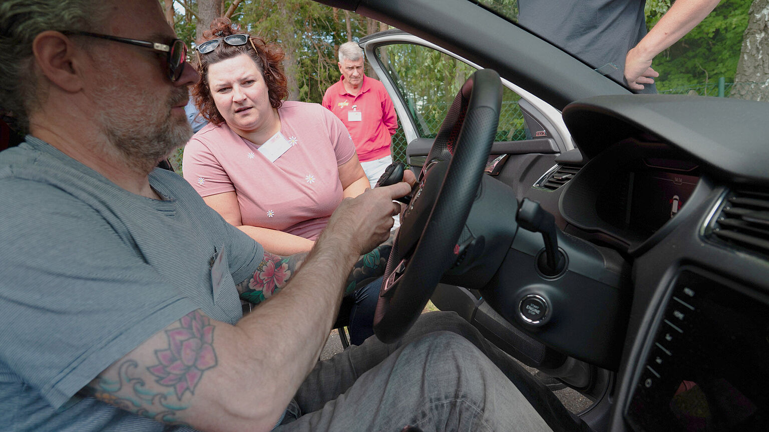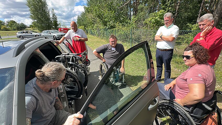 Währenddessen nimmt ACE-Partner Sebastian Kessler die individuellen Hilfsmittel und Umbauten der Fahrzeuge unter die Lupe. Der Rollstuhlfahrer ist Sachverständiger für die Fahrzeuganpassung mobilitätseingeschränkter Menschen. Er sieht auf den ersten Blick, wo Optimierungsbedarf besteht. Zum Beispiel bei der ferngesteuerten Rampe, mit der Kristin in ihr Auto hochfährt, um auf den Fahrersitz zu wechseln. Dieses Hilfsmittel läuft nicht einwandfrei. Auch die Befestigung des Rollstuhls im Fahrzeug könnte optimiert werden. „Ich bin so froh hier zu sein. Denn es geht an diesem Wochenende um viel mehr, als um Ladungssicherheit, tote Winkel und Bremswege“, betont sie. „Das Miteinander und der Austausch mit Menschen, die in ähnlichen Situationen sind wie ich und die wissen, wovon ich spreche, das ist mir genauso wichtig wie das Fahrtraining.“