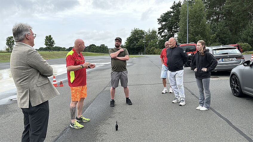 Aus dem Funkgerät, das auf dem Armaturenbrett ihres Autos liegt, ertönt die Stimme des Seminarleiters Marcel Bieck. Er steht am Rande des Übungsplatzes. Die Teilnehmenden rollen unter seiner Regie der Reihe nach auf die Strecke, um kritische Fahrmanöver zu trainieren.