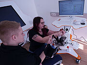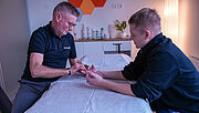 Sein Zeitplan umfasst zudem fünfmal wöchentlich zwei Stunden Ergotherapie und 70 Minuten Physiotherapie. „Manchmal muss ich ihn bremsen“, verrät seine auf Hand-Rehabilitation spezialisierte Ergotherapeutin Iris Stenzel. Einmal wöchentlich arbeitet sie zu Hause mit ihm, wo er die Aktivitäten des täglichen Lebens trainiert, wie Duschen, Waschen oder Kühlschrank öffnen. In ihrer Praxis hat sie spezielle Therapiegeräte, die das Training der Hände unterstützen. Iris Stenzel ist zufrieden mit ihrem Patienten. Lars hat sich sehr gut entwickelt. „Zu Beginn war es schwierig. Wir mussten sehr vorsichtig sein“, erläutert sie. „Aber Lars ist ein junger lebensfroher Mensch, der trotz des wahnsinnigen Schicksalsschlags nicht aufgegeben hat." Ergotherapeutin Iris Stenzel (links) setzt spezielle Reha-Geräte für das Handtraining ein. „Lars hat einen Plan, weiß, was er möchte. Und dafür kämpft er. Jeden Tag aufs Neue“, unterstreicht die Ergotherapeutin. Begeistert von Lars‘ Willenskraft zeigt sich auch Physiotherapeut Matthias Schulte, der beinahe täglich mit Lars arbeitet: „Wir sehen deutliche Fortschritte, vor allem in den Bewegungen, die er inzwischen selbst durchführen kann“, schildert Schulte.