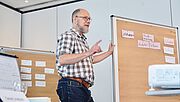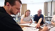 Tessa Erzgräber und Michael Schneider beugen sich mit drei anderen über das Foto. Es handelt sich um eine Situation aus dem Baumarkt. Die Gefährdungen sind schnell identifiziert: Die Podestleiter wird falsch benutzt, die Fluchtwege sind nicht frei und ganz im Hintergrund sieht man eine Person auf dem Gabelzinken eines Flurförderzeuges stehen. Ein absolutes No-go! Jeweils ein oder zwei Teammitglieder tragen die Ergebnisse anschließend vor der gesamten Gruppe vor. „Die Präsentation vor der Gruppe ist eine gute Übung. Nicht alle haben darin Erfahrung, aber es ist eine Situation, die im Betrieb als Sibe auf einen zukommt“, sagt Dozent Falkenhof. Überhaupt spielt die Kommunikation bei den Sicherheitsbeauftragten eine wichtige Rolle: Wie spreche ich meine Kollegen und Kolleginnen auf gewisse Sicherheitsaspekte an? „Ich fand es sehr hilfreich, dass wir darüber geredet haben, wie wir Sicherheitsthemen diplomatisch ansprechen – nicht mit der Brechstange, aber immer mit dem Blick aufs Ziel“, sagt Michael Schneider.