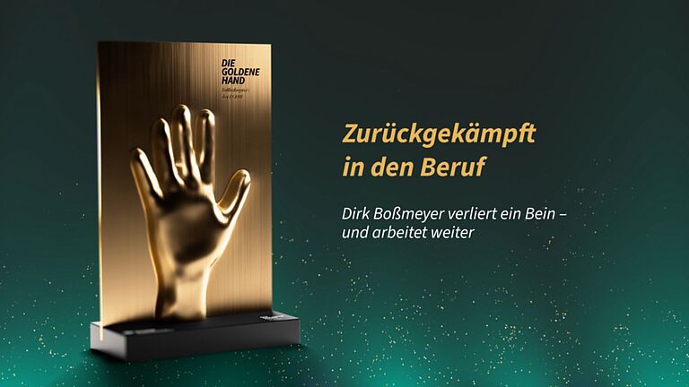 Durch einen schweren Arbeitsunfall verlor Dirk Boßmeyer im November 2022 sein linkes Bein. Sein Vorgesetzter, Thorsten Hammerich, und seine Kolleginnen und Kollegen am Standort von Getränke Essmann in Bordesholm/Wattenbek setzten alles daran, um dem Familienvater auf dem Weg zurück an seinen Arbeitsplatz zur Seite zu stehen. Für ihre vorbildliche Unterstützung erhielten sie den BGHW-Teilhabepreis „Die Goldene Hand 2025“.