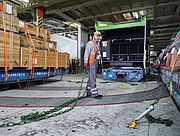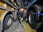 An Deck sichern die Lascher die beladenen Trailer mit schweren Ketten und Vorspannern. Diese werden mithilfe einer Laschkeule, einem Akkuschrauber, festgezogen und beim Löschen der Ladung wieder gelöst. Die körperlich anspruchsvolle Arbeit wird begleitet von einer Geräuschkulisse, die kaum Pausen kennt: Ketten rasseln, Laschkeulen surren, Zugmaschinen donnern über die Rampen zwischen den Schiffsdecks, während im Hintergrund die Schiffslüftung röhrt. Eine lärmende Mischung, die das Gehör dauerhaft belastet. Wie laut es tatsächlich ist, weiß Wolfgang Pajer. Die Aufsichtsperson der BGHW führte schon Lärmschutzmessungen für „High & Heavy“ im Frachtschiff durch und stellte einen Mittelwert von 88 Dezibel fest. Zum Vergleich: Liegt der Tageslärmpegel über 80 Dezibel, müssen Unternehmen Gehörschutz zur Verfügung stellen. Ab 85 Dezibel sind Beschäftigte verpflichtet, ihn zu tragen. Andernfalls drohen dauerhafte Gehörschäden.